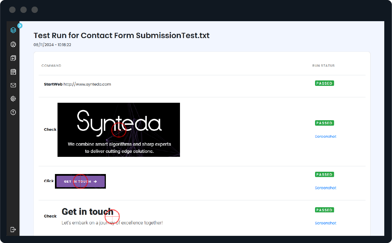 Stay informed with EyeServer’s intuitive Dashboard. Monitor every aspect of your automated and manual test runs, from feature coverage to product quality. Visualize estimated quality and keep track of issues as they arise. Set up your tests to run on your schedule and receive email notifications with results, ensuring you’re always up-to-date on the status of your testing.